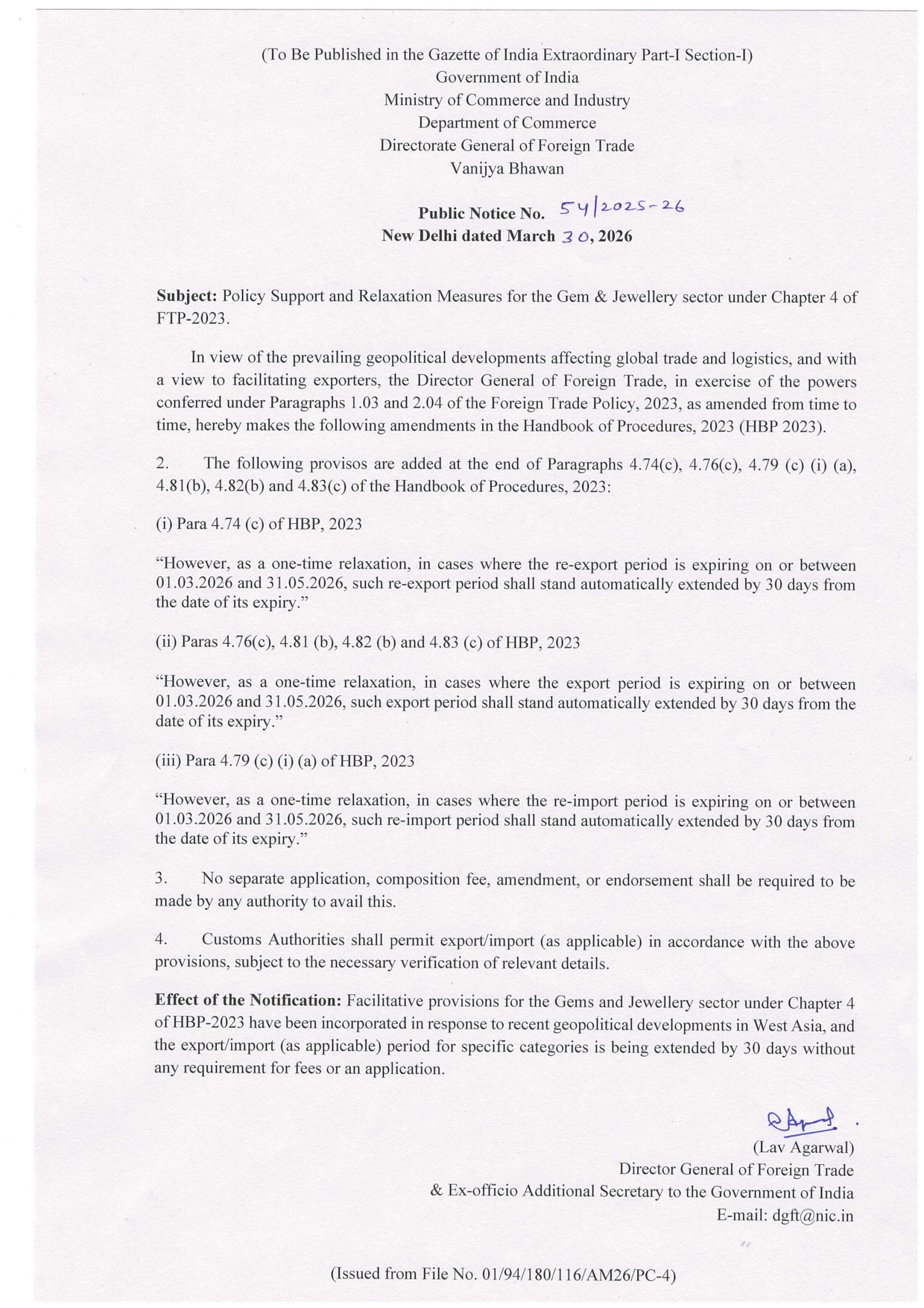 30-Day Relief for Gems & Jewellery Exporters Posted On April 3, 2026 Tags:DGFT Notification Related Posts DGFT Updates SION A-290 | UOM Amended Up to ₹10 Cr Credit Guarantee Launched | Collateral Support for MSME Exporters | 2025–26 Important Amendment in Value Addition Requirements for Spices About The Author admin Add a Comment Cancel replyYour email address will not be published. Required fields are marked *Comment Save my name, email, and website in this browser for the next time I comment.