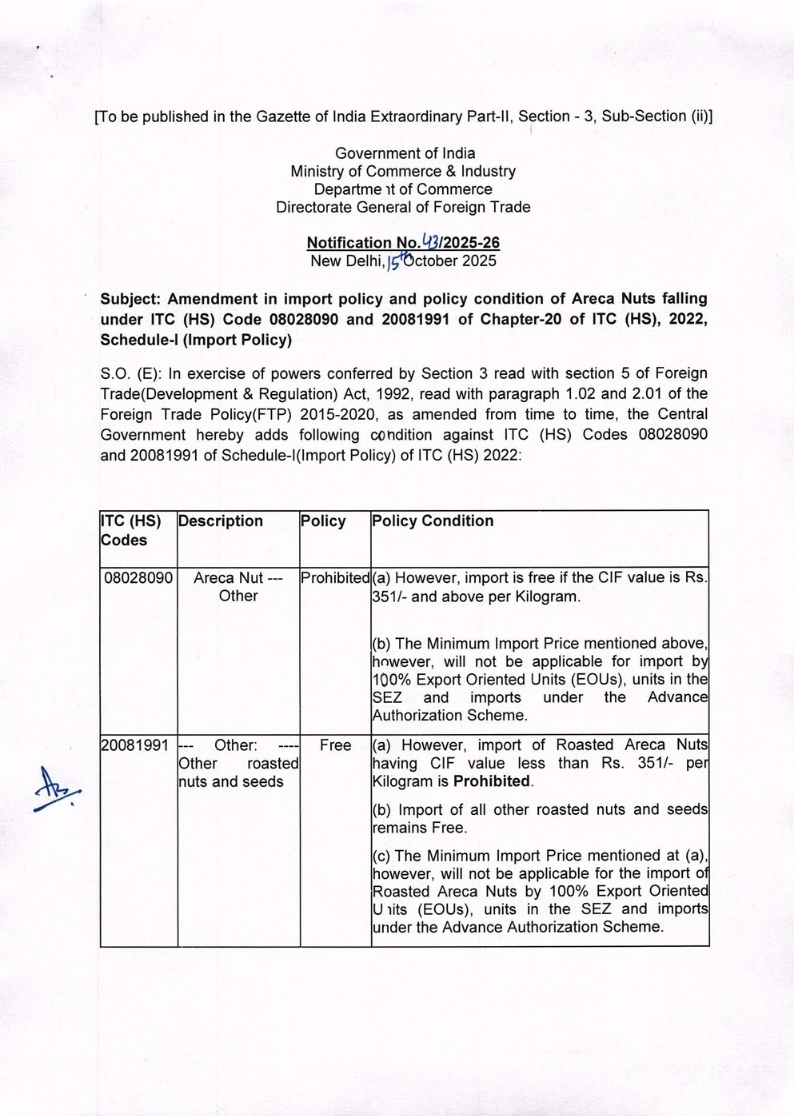 Import Policy Update – Roasted Areca Nuts Below ₹351/kg Now Prohibited Posted On October 15, 2025 Related Posts Clarifying EO discharge of Advance Authorization bearing Customs Notification Numbers Important Update: Ad-hoc Norms Clarification Government Sets Minimum Import Price (MIP) on Soda Ash! About The Author admin Add a Comment Cancel replyYour email address will not be published. Required fields are marked *Comment Save my name, email, and website in this browser for the next time I comment.