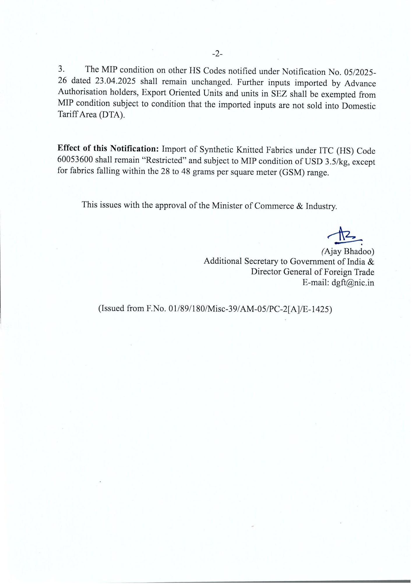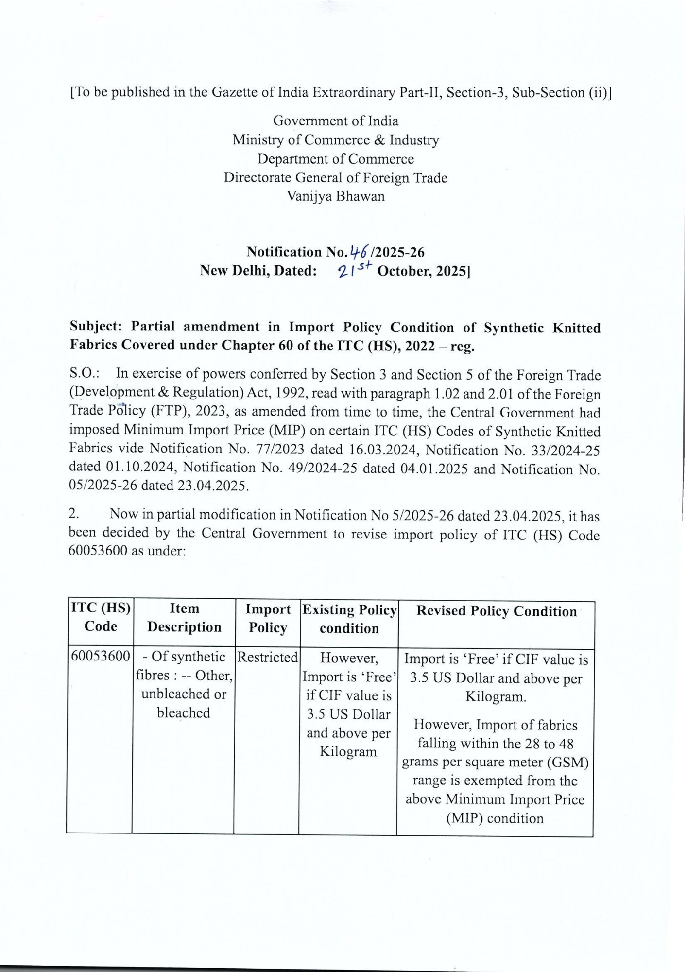 Import Policy Update – Synthetic Knitted Fabrics under MIP $3.5/kg, GSM 28-48 Exempt Posted On October 21, 2025 Related Posts Amendment in Export Policy of broken rice under HS Code 1006 40 00 Streamlining of Halal Certification Process for Meat and Meat Products DGFT e-CoO Platform Last Call for Onboarding! Deadline: Aug 31, 2023 About The Author admin Add a Comment Cancel replyYour email address will not be published. Required fields are marked *Comment Save my name, email, and website in this browser for the next time I comment.