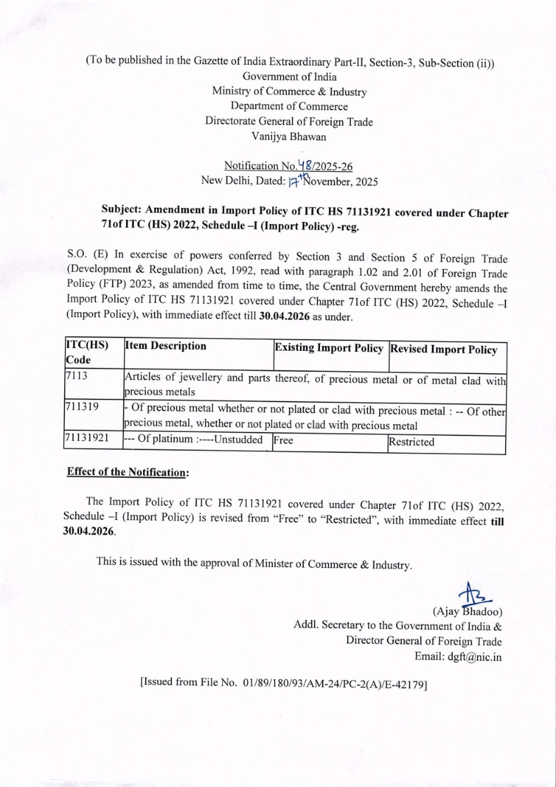 Jewellery Imports Restricted till 30 Apr 2026 Posted On November 17, 2025 Tags:DGFT Notification 2026 Related Posts The Trail Period of CHIMS is Extended by further two months Upto 30.09.2021 and the registration at CHIMS portal will be effective from 01.10.2021 New SION Alert: A-3685 Introduced for Doxycycline 100mg Dispersible Tablets Onion Export Regulations: Shifting from ‘Free’ to ‘Prohibited’ – A Policy Update until March 31, 2024 About The Author admin Add a Comment Cancel replyYour email address will not be published. Required fields are marked *Comment Save my name, email, and website in this browser for the next time I comment.
