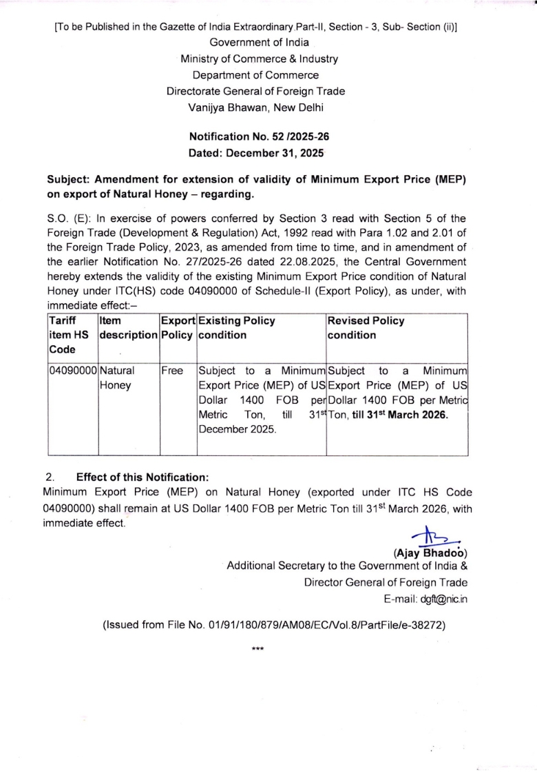 MEP $1400 Extended till 31 March 2026 | Natural Honey Exports Posted On January 1, 2026 Tags:DGFT Notification 2026 Related Posts Import Policy Alert! Platinum Import Now Restricted! Jewellery Imports Restricted till 30 Apr 2026 SION C-888 Reinstated & Amended | DGFT Update About The Author admin Add a Comment Cancel replyYour email address will not be published. Required fields are marked *Comment Save my name, email, and website in this browser for the next time I comment.