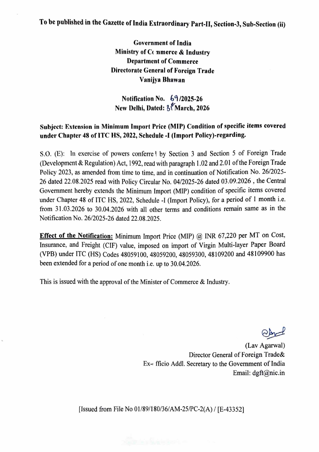 MIP on Paper Board Imports Extended Till 30 April 2026 Posted On April 3, 2026 Tags:DGFT Notification Related Posts Non-Basmati White Rice Export Policy Revised: From Prohibited to Fee Subject to MEP of 490 $ Per Ton Government Sets Minimum Import Price (MIP) on Soda Ash! Import Policy Update: Roasted Areca Nuts Now Prohibited Below ₹351/kg – Know the New Rules! About The Author admin Add a Comment Cancel replyYour email address will not be published. Required fields are marked *Comment Save my name, email, and website in this browser for the next time I comment.
