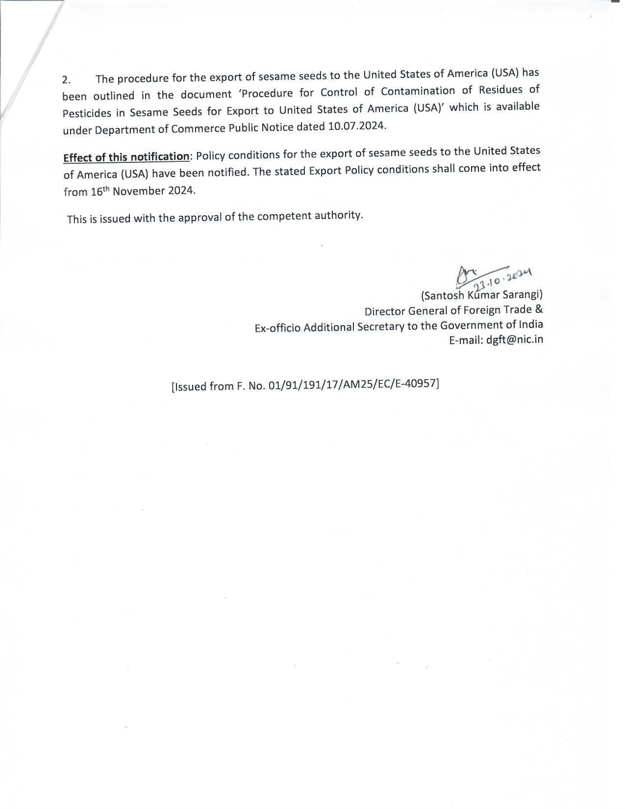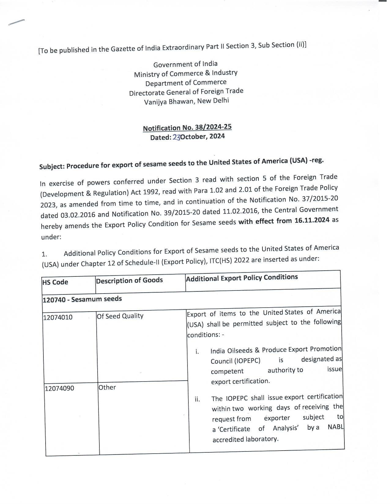 New Export Policy for Sesame Seeds to the USA Posted On October 23, 2024 Tags:DGFT Notification Related Posts Amendment in Export Policy of Amphotericin-B Injections Leather Export Now Easier – Port & Testing Rules Removed Import Policy Update: Restrictions on HSN 8471 Items – Immediate Effect! Enrich Professional Services About The Author admin Add a Comment Cancel replyYour email address will not be published. Required fields are marked *Comment Save my name, email, and website in this browser for the next time I comment.