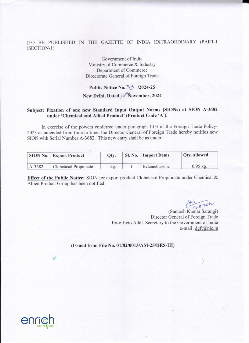 New Standard Input-Output Norm (SION) Notification Posted On November 19, 2024 Tags:DGFT Notification Related Posts Export Ban Alert: De-Oiled Rice Bran Amendments in Para 4.42 of the Handbook of Procedures 2015-2020. New Import Regulations for IT Hardware Enrich Services About The Author admin Add a Comment Cancel replyYour email address will not be published. Required fields are marked *Comment Save my name, email, and website in this browser for the next time I comment.