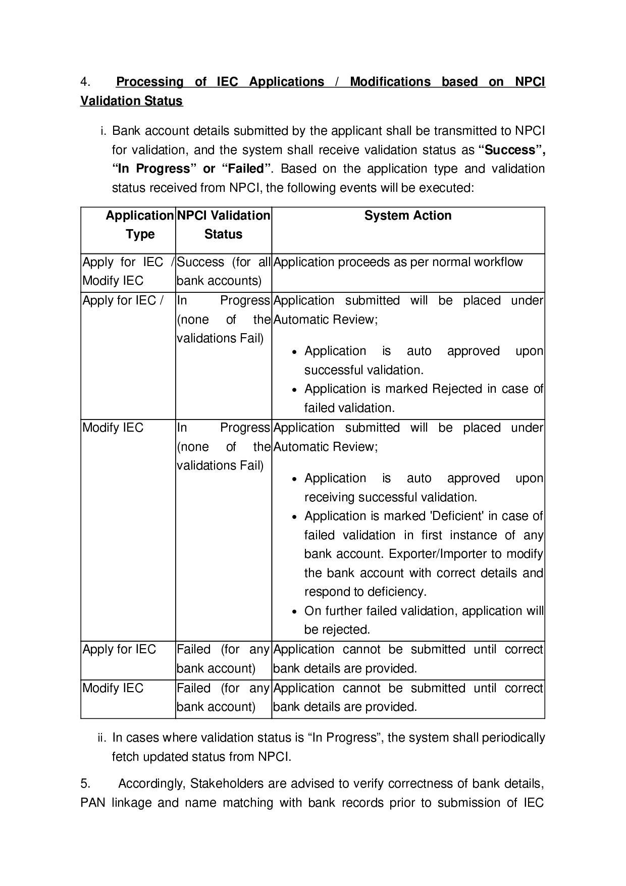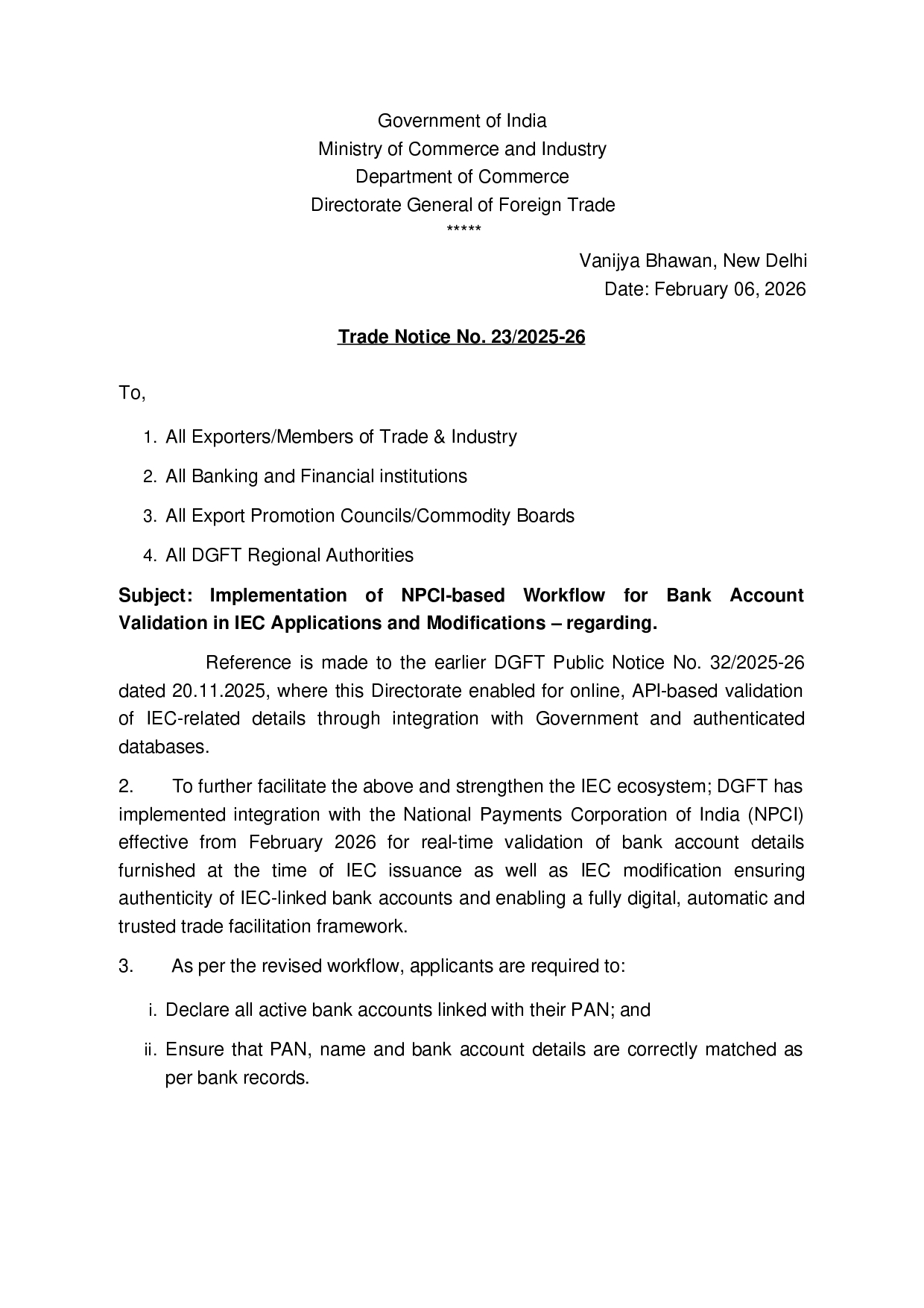 NPCI-Based Bank Validation Now Mandatory for IEC Applications (Feb 2026 Onwards) Posted On February 6, 2026 Tags:DGFT Notification Related Posts De-Activation of IECs not updated on the DGFT Scheme Guidelines for Remission of Duties and Taxes on Exported Products (RoDTEP) Inclusion of additional export items in Appendix 4R with effect from 15.12.2022 About The Author admin Add a Comment Cancel replyYour email address will not be published. Required fields are marked *Comment Save my name, email, and website in this browser for the next time I comment.