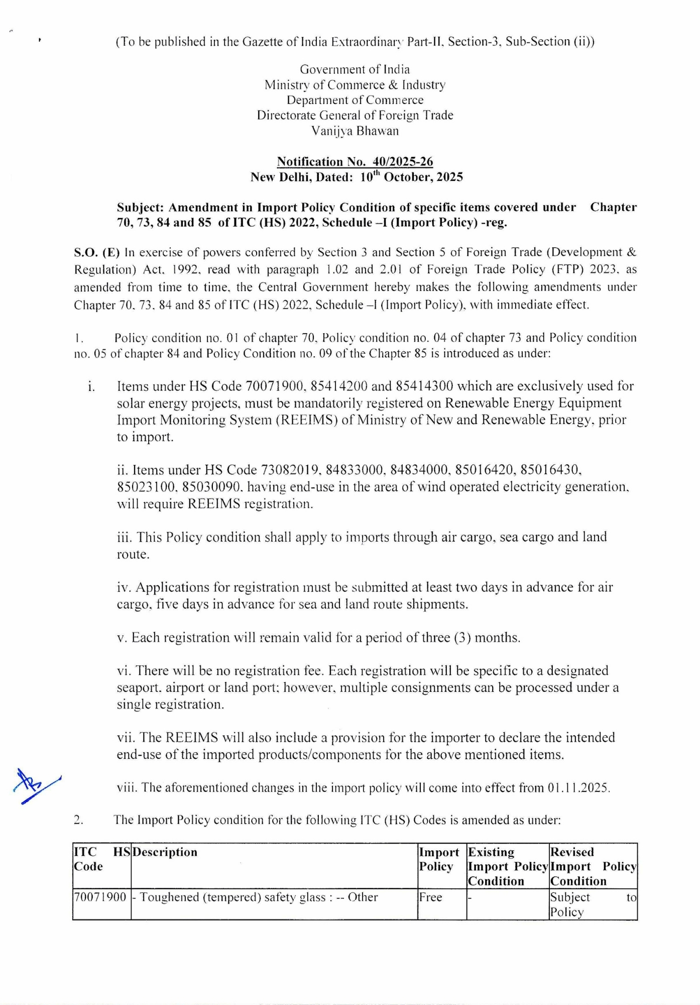 REEIMS Registration Mandatory for Solar & Wind Imports from 01.11.2025 Posted On October 10, 2025 Related Posts Export of Broken Rice on Humanitarian Grounds – 27th July, 2023 Amendment in import policy of Integrated Circuit s (ICs) and incorporation of policy condition for HS Codes 85423100, 85423900, 85423200, 85429000, and 85423300, of Chapter 85 of1TC (HS), 2017, Schedule – I Procedure and Criteria for submission and approval of applications for export of Diagnostic Kits and their components/laboratory reagents About The Author admin Add a Comment Cancel replyYour email address will not be published. Required fields are marked *Comment Save my name, email, and website in this browser for the next time I comment.