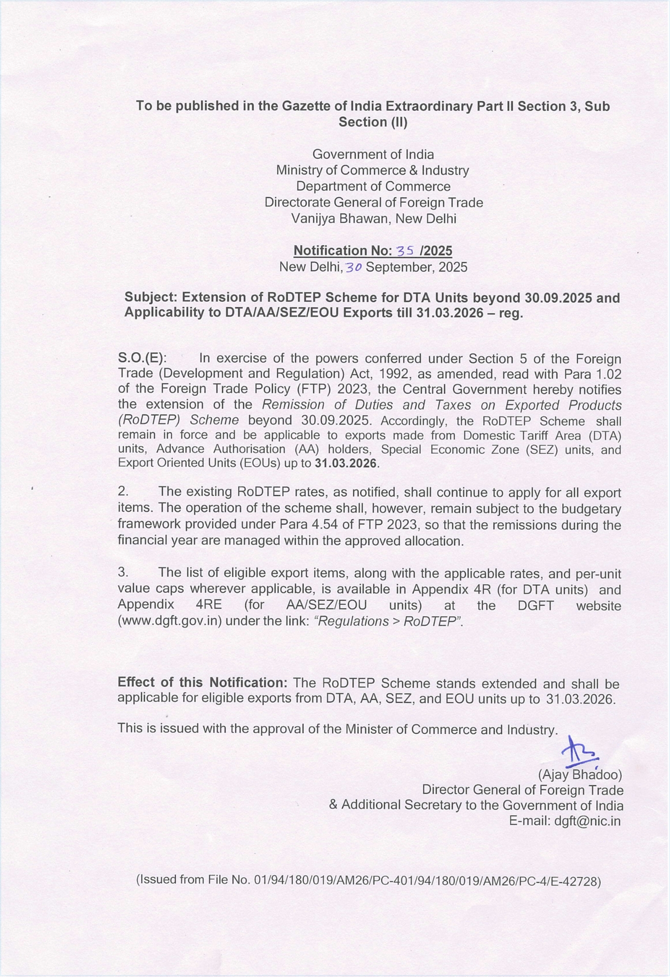 RoDTEP Benefits Apply to DTA, AA, SEZ & EOU Till 2026 Posted On September 30, 2025 Tags:DGFT Notification Related Posts Extension of Last Date for Submitting Applications for Script based FTP Schemes Digital Shift: Mandatory Online Submissions & Payments for Trade Compliance Import Policy Update: Restrictions on HSN 8471 Items – Immediate Effect! Enrich Professional Services About The Author admin Add a Comment Cancel replyYour email address will not be published. Required fields are marked *Comment Save my name, email, and website in this browser for the next time I comment.