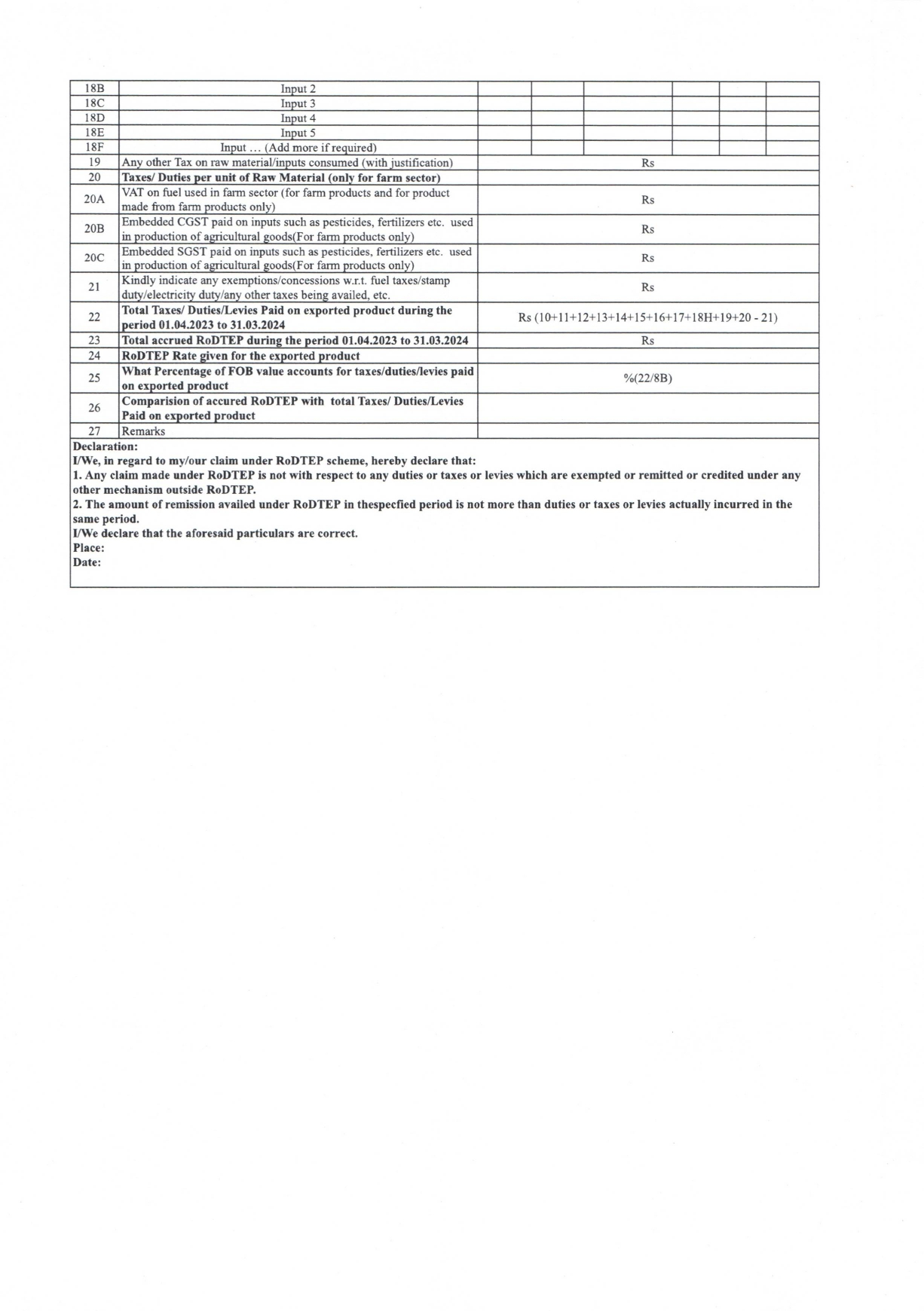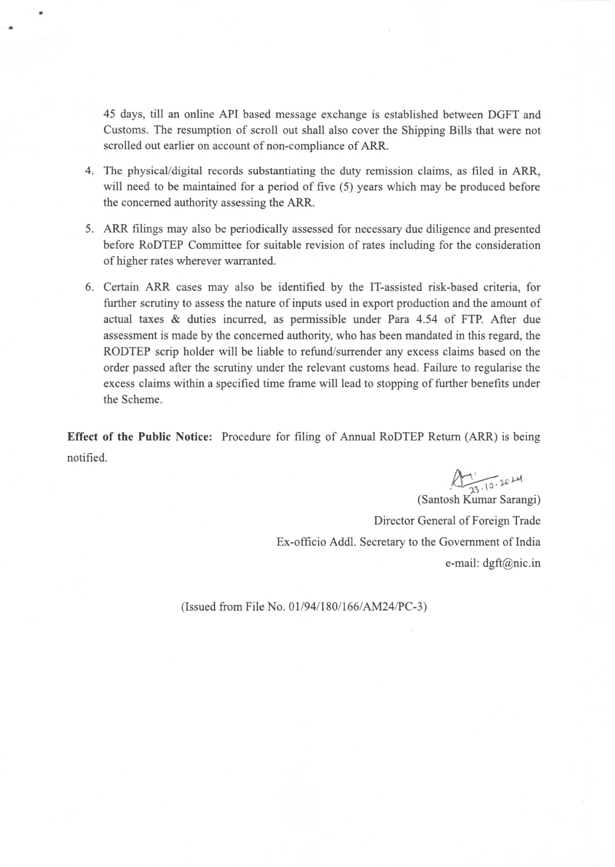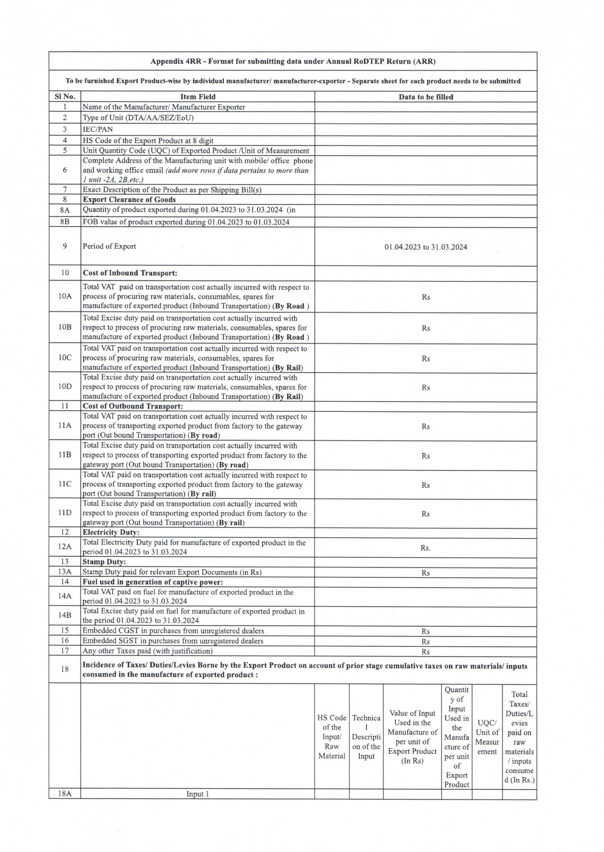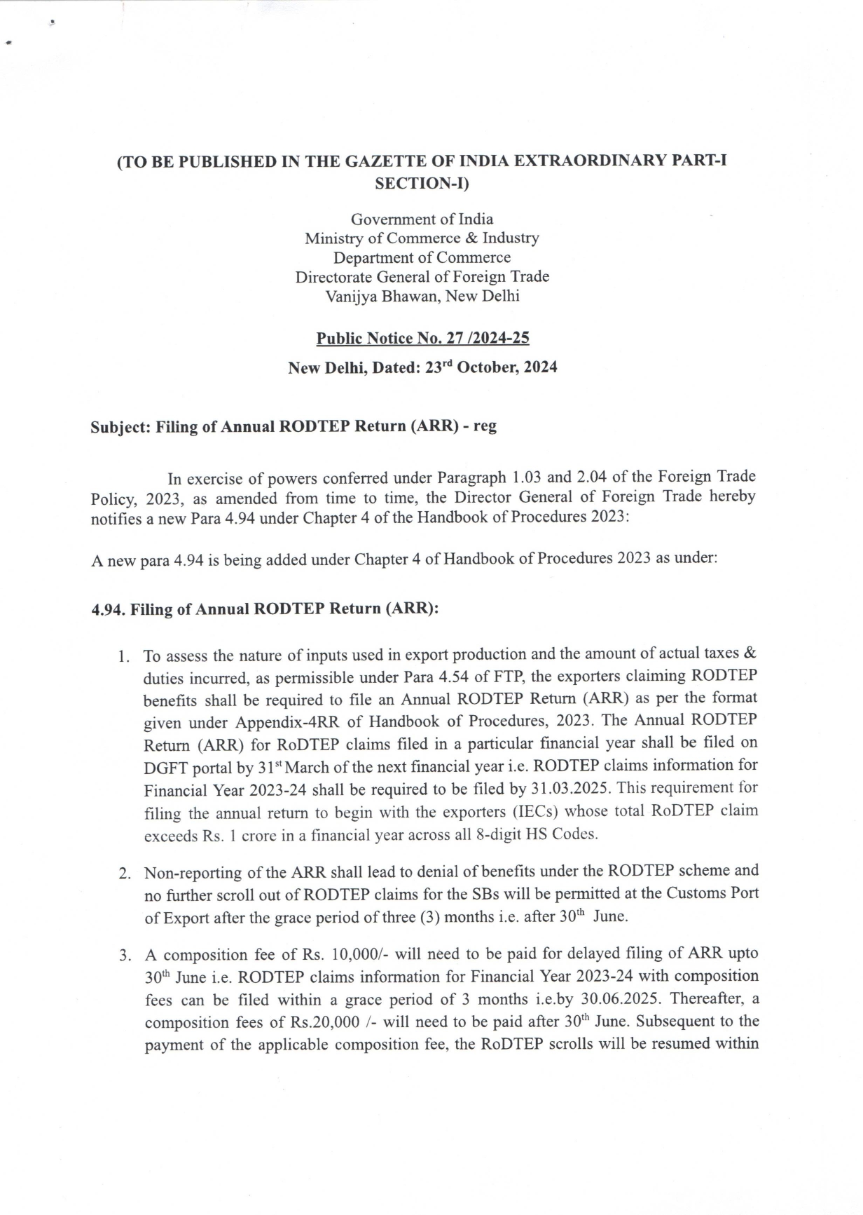 Submit Your Annual RODTEP Return by March 31, 2025 Posted On October 25, 2024 Tags:DGFT Notification Related Posts RoDTEP Rate Alignment Effective 01.05.2025 Import policy of mosquito killer racket under HS Codes 85167920 and 85167990 is revised from ‘Free’ to ‘Prohibited’ if C.I.F value is below Rsl21/per racket New SION Alert: A-3685 Introduced for Doxycycline 100mg Dispersible Tablets About The Author admin Add a Comment Cancel replyYour email address will not be published. Required fields are marked *Comment Save my name, email, and website in this browser for the next time I comment.