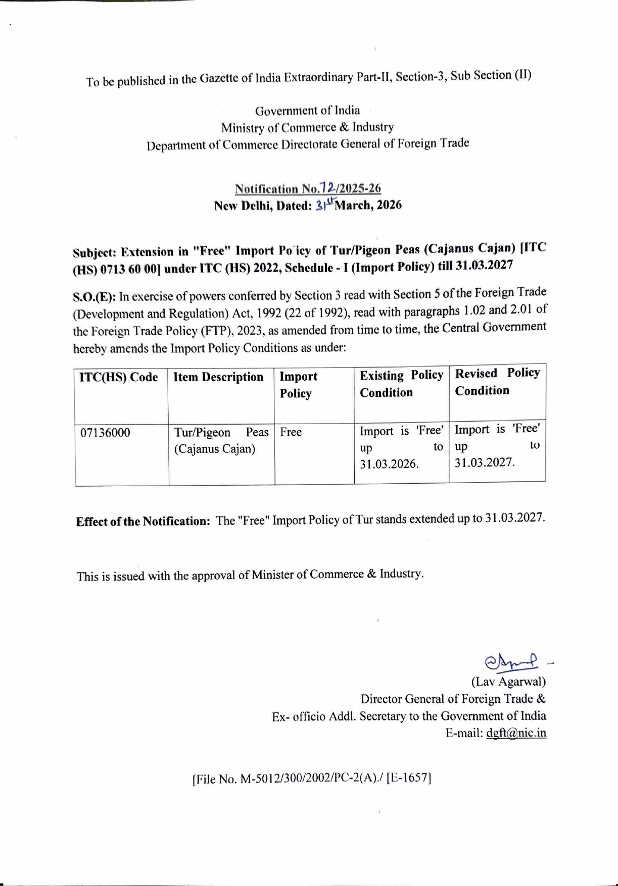 Tur (Pigeon Peas) Import Remains Free Till 31 March 2027 Posted On April 3, 2026 Tags:DGFT Notification Related Posts Big News for Onion Exporters! Import policy of mosquito killer racket under HS Codes 85167920 and 85167990 is revised from ‘Free’ to ‘Prohibited’ if C.I.F value is below Rsl21/per racket Export Policy Update: Non-Basmati Rice About The Author admin Add a Comment Cancel replyYour email address will not be published. Required fields are marked *Comment Save my name, email, and website in this browser for the next time I comment.