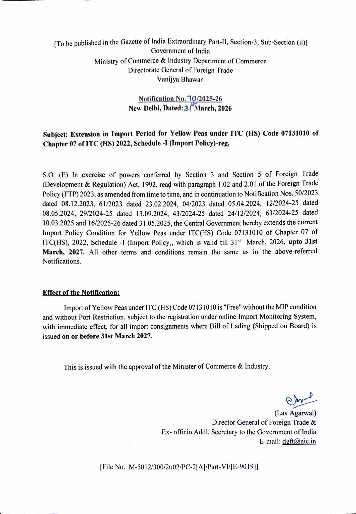 Yellow Peas Import Remains Free Till 31 March 2027 Posted On April 3, 2026 Tags:DGFT Notification Related Posts RoDTEP Rates Restored to 100% – Relief for Exporters Revised Operational Guidelines for AMI Sub-Scheme Updated Launch Date for eCoO 2.0 System About The Author admin Add a Comment Cancel replyYour email address will not be published. Required fields are marked *Comment Save my name, email, and website in this browser for the next time I comment.